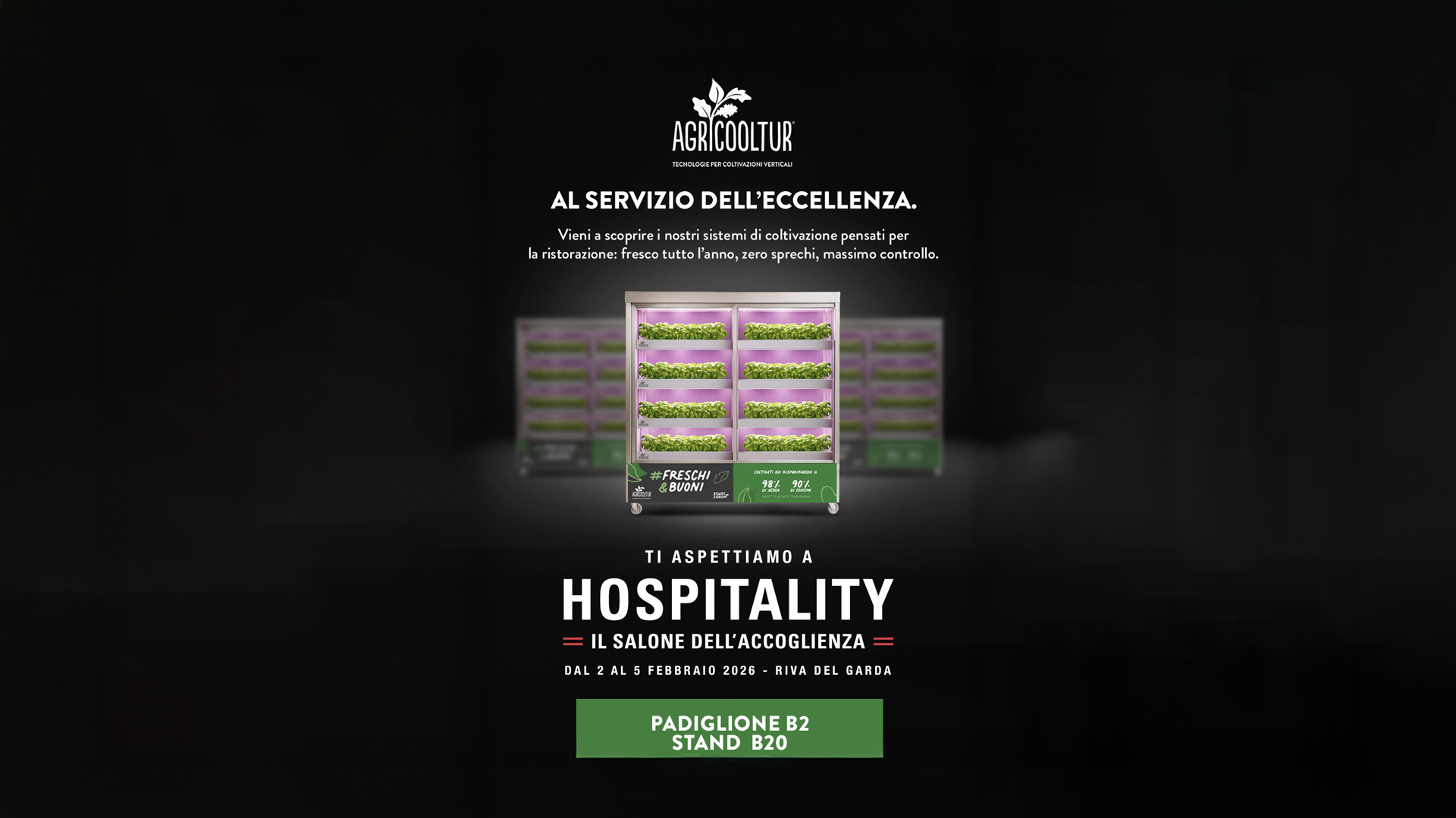 Le tecnologie Agricooltur® si basano su un sistema completo, dalla germinazione alla coltivazione, all’interno di strutture verticali automatizzate che permettono la coltivazione in ambienti chiusi con limitato utilizzo di suolo.